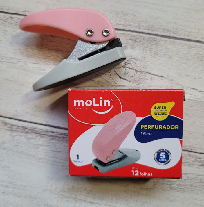 Perfurador de 1 furo só, da marca Molin. Fofíssimo, na cor rosa, pode furar até 12 folhas de uma só vez!